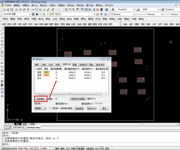 7、进入界面后,点击选择建筑,然后选取处理过的建筑,即会生成图表,里面建筑面积一目了然,并且可以导出表格