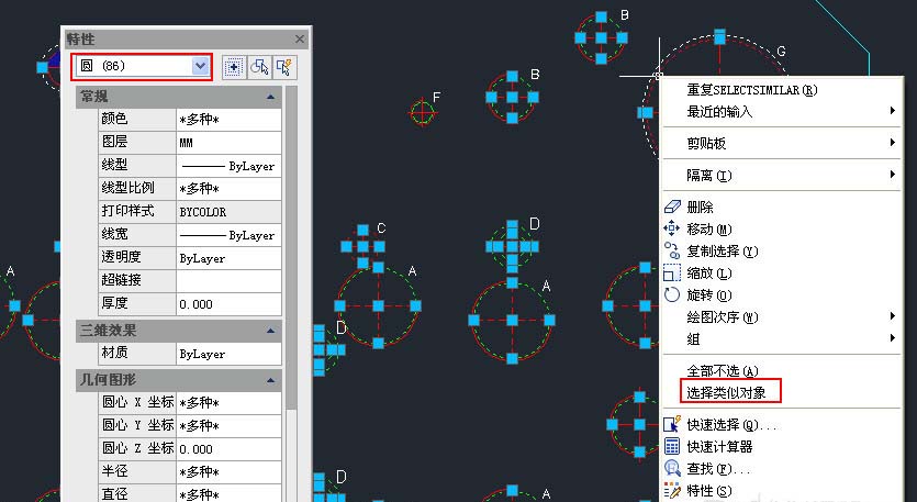 当选择了一个对象后,右键菜单中会提供类似对象和全部不选的选项。选择类似对象可用于选取同类型的对象和同名的图块,个人觉得还是比较有用的。例如我要选择图中所有圆,我只选择一个圆,然后在右键菜单中选择“选择类似对象”,就可以将同一图层上所有圆都选中,如下图所示。