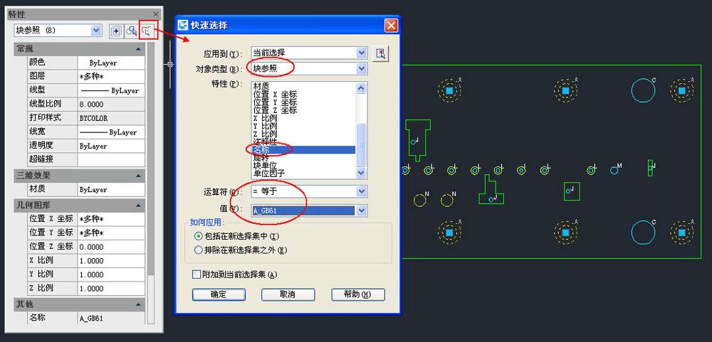 快速选择还可以根据情况多次使用,可以在选择集中进一步利用条件进行过滤,也可以添加或排除一些满足设定条件的对象,快速选择回头单独讲解,这里就不再详细介绍了。