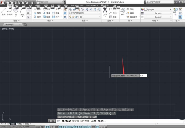 5、我们一次输入矩形的长宽。依次输入长度500,enter, 宽度300,enter。不清楚的朋友可以对照下图进行操作。每输入一个参数后记得用回车键来结束。