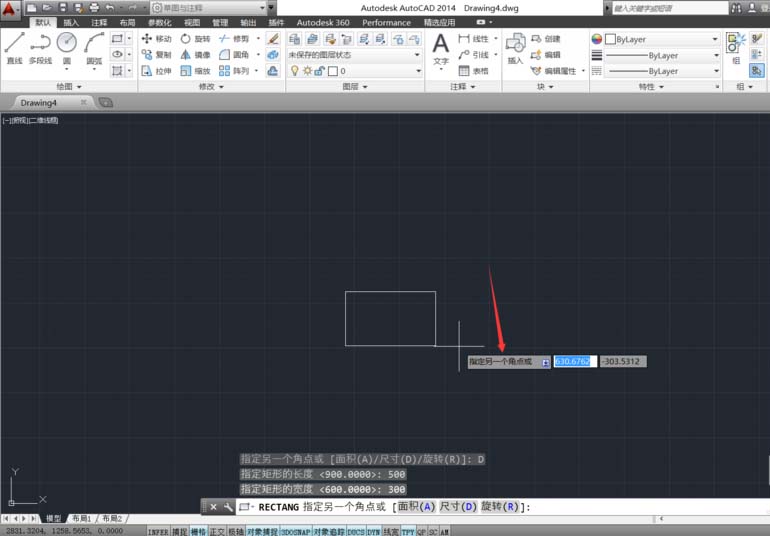 6、这时候一个500*300的矩形就做出来了,但是当我们移动光标的时候,矩形似乎并没有定下来而是在围绕第一个指定点跳动,并出现“指定另一个角点或”的字样,这时候我们只有选择好我们需要的方向,单击鼠标一下就可以。一个有参数的矩形做好了。