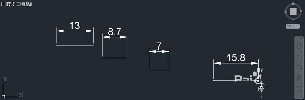 1、开一张空图,绘制几条直线,长度可以是13、8.7、7、15.8等随意的数值,然后输入DLI,用默认的标注样式在给这些直线标注上尺寸, 如图所示。