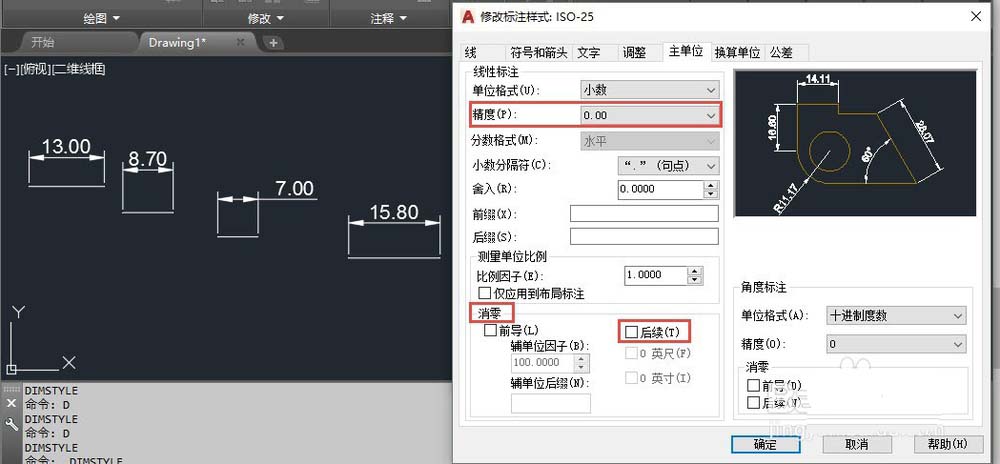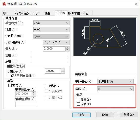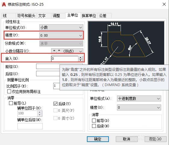 3、只有当我们需要标注值是一些特殊值,如0.25、3、5的倍数时,我们才输入舍入值。上面说的精度、舍入、消零都是针对线性的标注的,角度标注也有精度和消零的设置,但没有舍入的设置,如图所示。