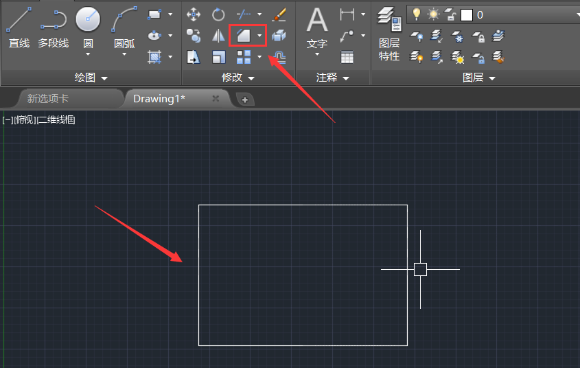 3、点击矩形命令,在工作区绘制一个矩形,然后在上面找到倒角命令,如图所示: