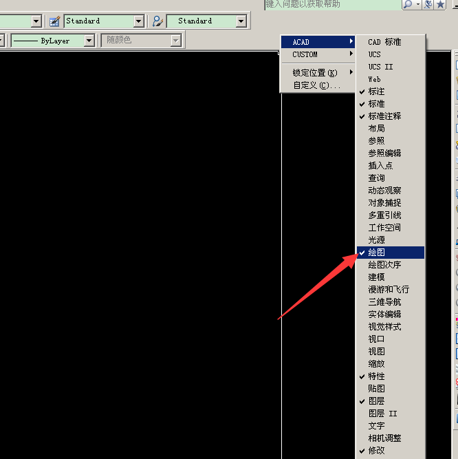 2、然后把鼠标移至第一个ACAD,之后点击一下绘图打下勾。(也可以吧其它的工具也打勾,拿到窗口上来)