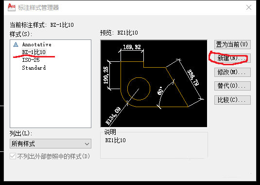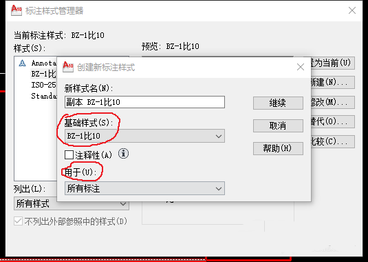 2、上述方法对于数量十分多、且比例尺种类繁多的时候,就显得不太方便,在标注样式管理上就有点啰嗦。这里展示一种简便的方法:比如,对于1:10比例尺的一幅图,新建一个标注样式,命名为:BZ-1比10