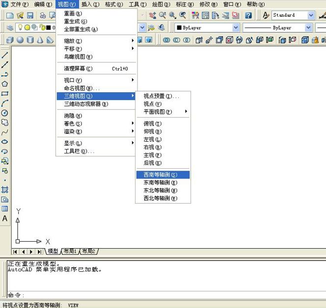 1、打开CAD软件,选择“视图”中的“三维视图”中的“西南等轴侧”视图。