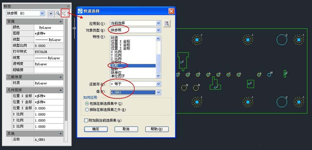 在绘图过程有时需要将相同的图块选择出来,好统计这些图块的数量或将这些图块一次性删除,或者将同类的对象选择出来进行相同的操作。