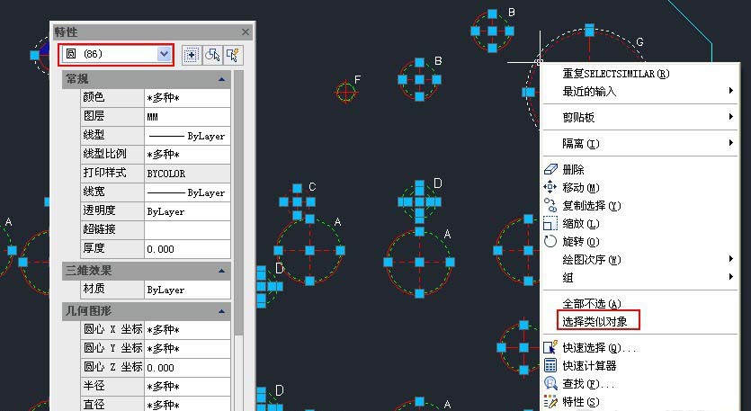 1、当选择了一个对象后,右键菜单中会提供类似对象和全部不选的选项。选择类似对象可用于选取同类型的对象和同名的图块。例如我要选择图中所有圆,我只选择一个圆,然后在右键菜单中选择“选择类似对象”,就可以将同一图层上所有圆都选中,如下图所示。