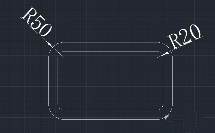 4、执行圆角命令(F),根据命令行提示,选择“半径(R)”选项,再输入半径为50mm,然后分别选择外侧矩形的二条交叉线进行圆角,用同样的方法再次设置半径为20mm,对内矩形进行圆角操作。
