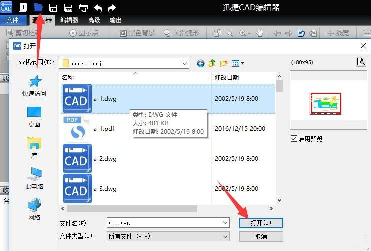 2、接下来我们直接利用CAD编辑器打开想要进行分析的CAD文档,如图所示,点击“打开”按钮后选择相应的文档即可打开。
