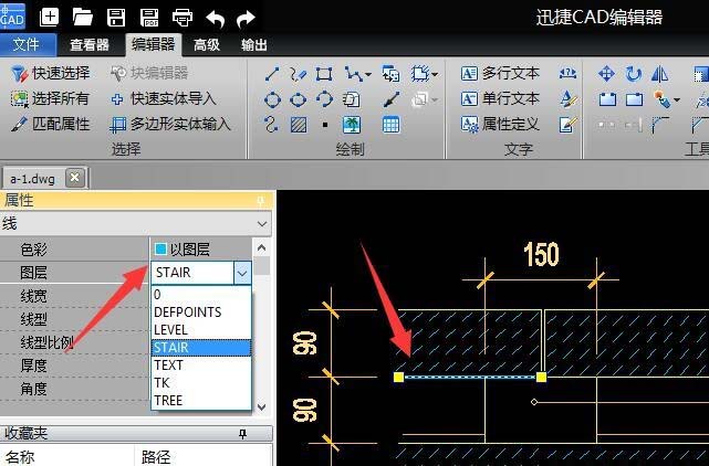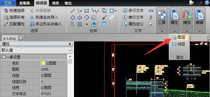 4、为了查看CAD图纸中线条颜色所代表的具体含义,我们可以切换到“编辑器”功能区,点击“属性”列表中的“图层 ”按钮。