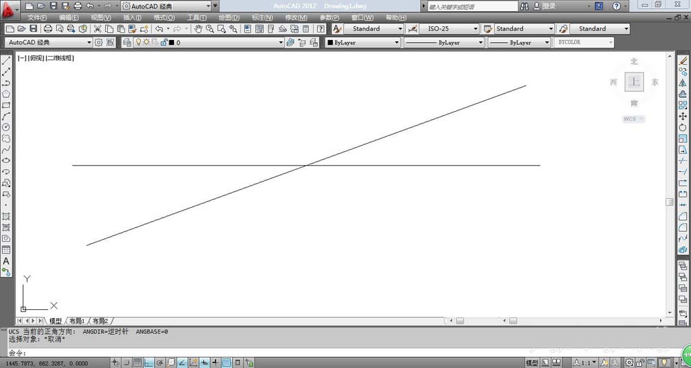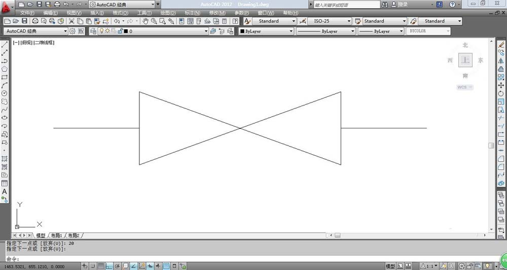 4、再次输入快捷键RO或者选择菜单栏中的“修改”→“旋转”,选中剩下的一条直线,以中点为基点,然后旋转-20个角度,最后结果如图所示。