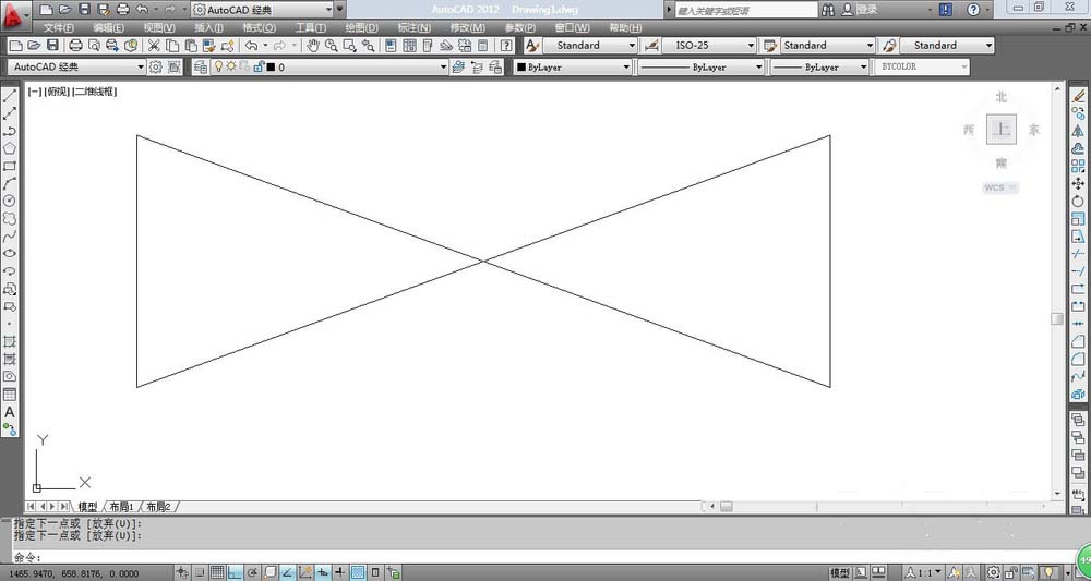 7、输入快捷键L直线命令,以刚开始画的两条斜线的交点为基点垂直向上画一条长度为12的直线,然后在水平向右画一条10的直线,最后结果如图所示。