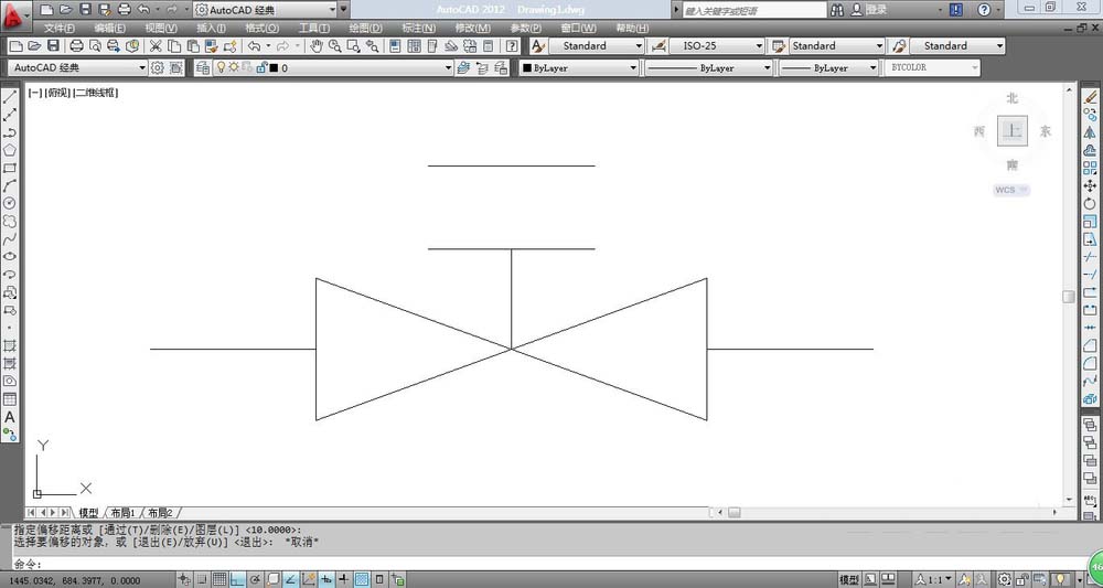 8、选中刚才画的水平向右的10个单位的直线,然后以左端点向右拉伸,此时输入10,也就是说向左拉伸10个单位让整条直线变成20个单位,然后选中刚才拉伸好的直线,输入快捷键O进行向上偏移,偏移的距离是10这样就完成了安全阀的绘制,最后结果如图所示。