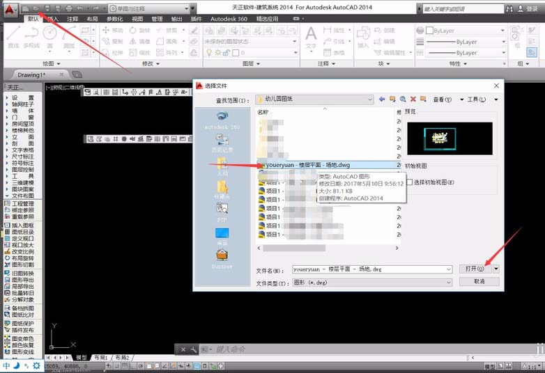 2、使用“Ctrl+O”的开启命令后,系统会自动弹出文件浏览窗口,我们选择需要导出PS格式的CAD文件,直接双击,或者选中后点击“打开”命令,都可以开启文件。