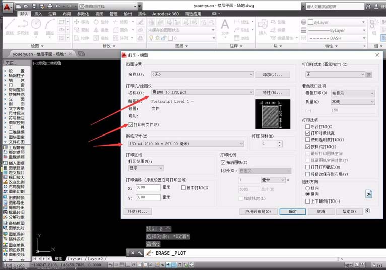 5、在“名称”选项中,选择导出的格式名称,我们需要导出到PS格式文件,因此我们选择“EPS”格式,并且勾选“打印到文件”,并在下方选择打印的图纸大小。