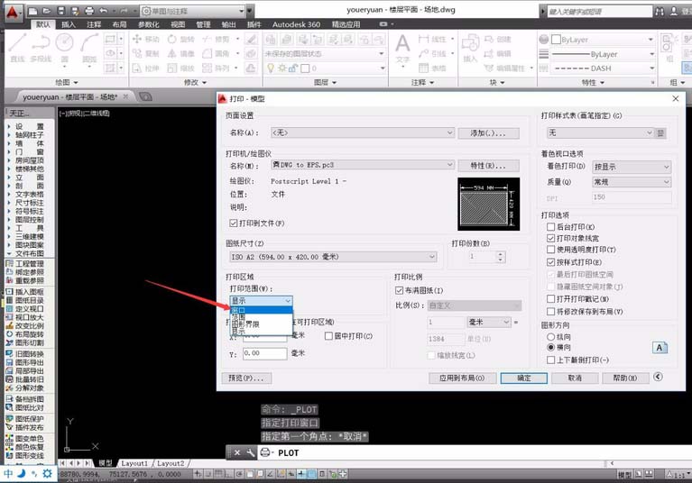 6、随后,在“打印范围”中,选择“窗口”,对打印区域进行框选,这样就能够打印特定的区域图纸,而不会打过多的无用区域。