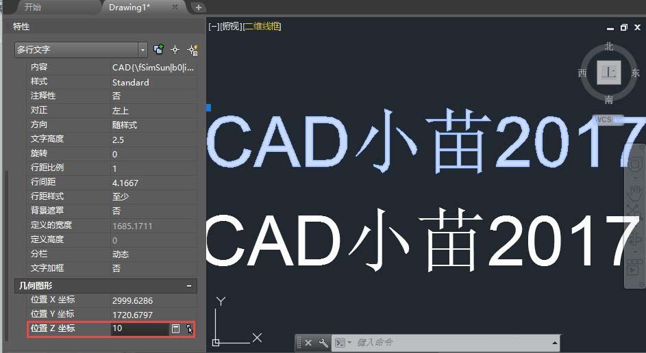 2、选中文字,输入CO,回车,复制一份文字到上方。选中复制的文字,打开特性面板(CTRL+1),在特性面板中将Z坐标设置为10,如下图所示。