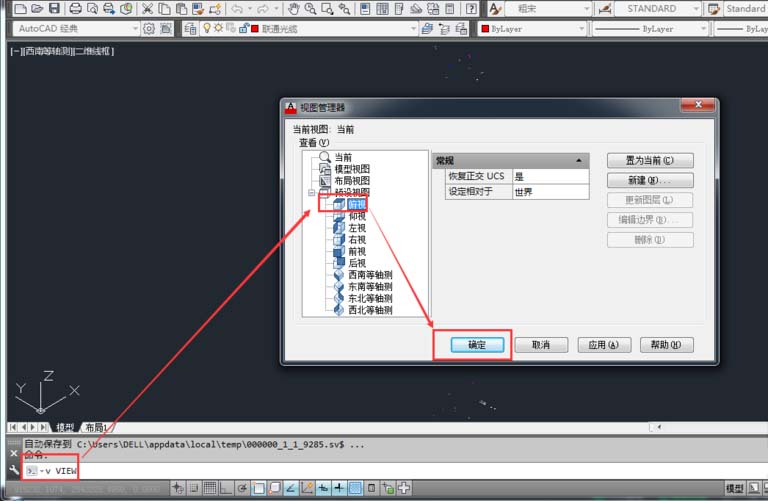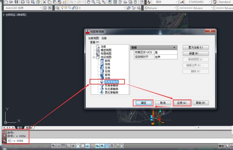 2、在这里我们可以切换到西南等轴测,检查观看,在命令行输入“V”,按键盘上的“空格键盘”或者“Enter”。弹出视口管理器中双击选择“西南等轴测”。点击“应用”。“确定”。如下图:
