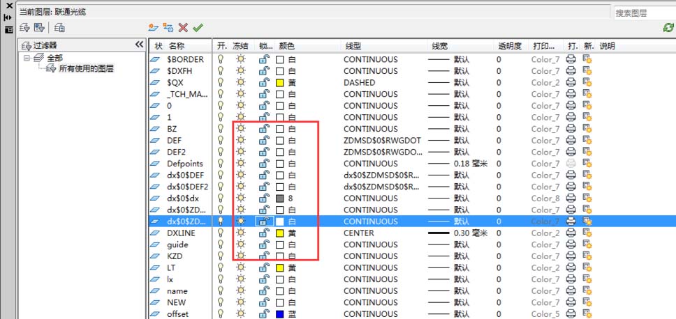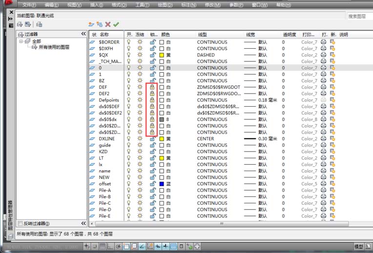 3、从上图可以看了很多线条。文字,都不在同一个平面上。接下来我们把它放在平一个平面上。但是现在我先来看一下图层有没有被锁住,如果被锁了要把锁打开。输入“la"命令,按键盘上的“空格键盘”或者“Enter”。弹出图层管理器。把标“锁”的图层都打开。依次可以拉动滚动条检查。完成后点击关闭图层管理器。如下图: