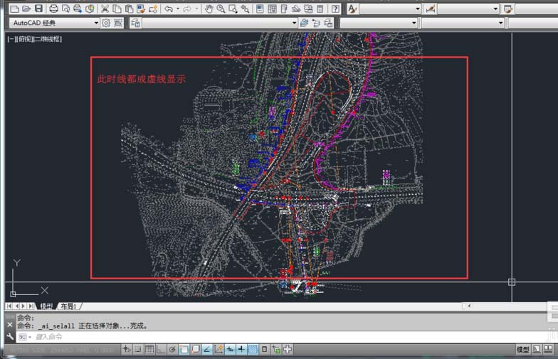 4、在命令行输入“V”,按键盘上的“空格键盘”或者“Enter”。回到俯视视图。按键盘上的“ctrl+a”将画面全选。如下图: