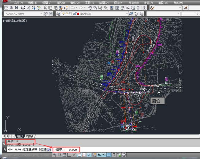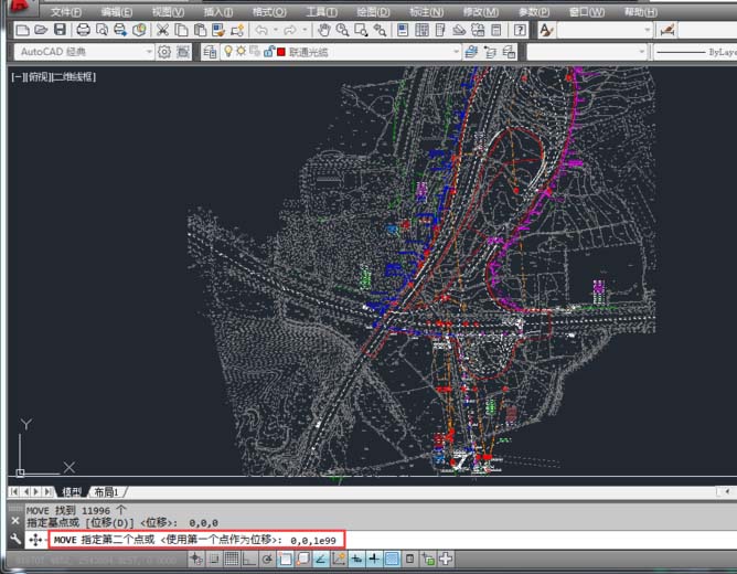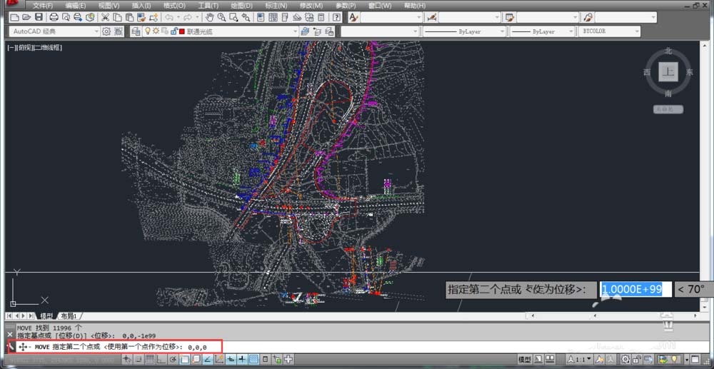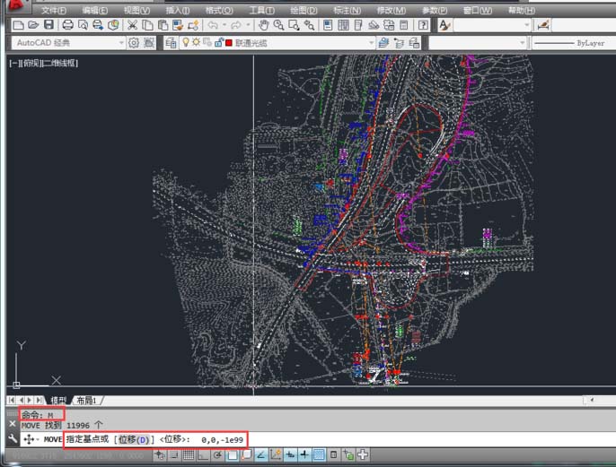 6、按键盘上的“ctrl+a”将画面全选。在命令行输入“M”,按键盘上的“空格键盘”或者“Enter”。再次输入第一点位置 0,0,-1e99 按键盘上的“空格键盘”或者“Enter”确定,然后输入第二点位置 0,0,0 按键盘上的“空格键盘”或者“Enter”确定。如下图: