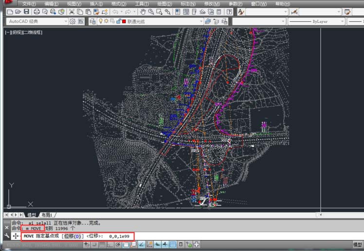 7、按键盘上的“ctrl+a”将画面全选。在命令行输入“M”,按键盘上的“空格键盘”或者“Enter”。再次输入第一点位置 0,0,1e99 按键盘上的“空格键盘”或者“Enter”确定,然后输入第二点位置 0,0,-1e99 按键盘上的“空格键盘”或者“Enter”确定。如下图:
