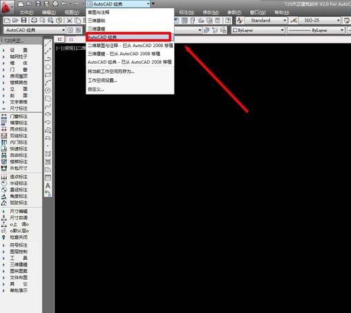 3、在天正cad建筑软件上方,选择【autoCAD经典】模式