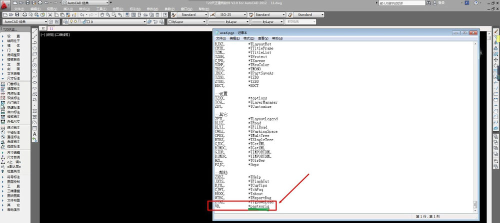 6、在打开的文档窗口里,下拉最后一行,写上【VB, *pasteorig】编码(不包含【】)这里VB可以使用自己习惯的快捷键,注意不要和别的快捷键冲突