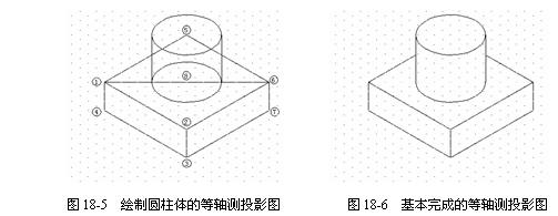 (1) 切换到上轴测面,利用端点捕捉,用直线将点①和点⑥连接起来(参看图18-5)。这条线是为确定圆柱底面中心点而作的辅助线。
