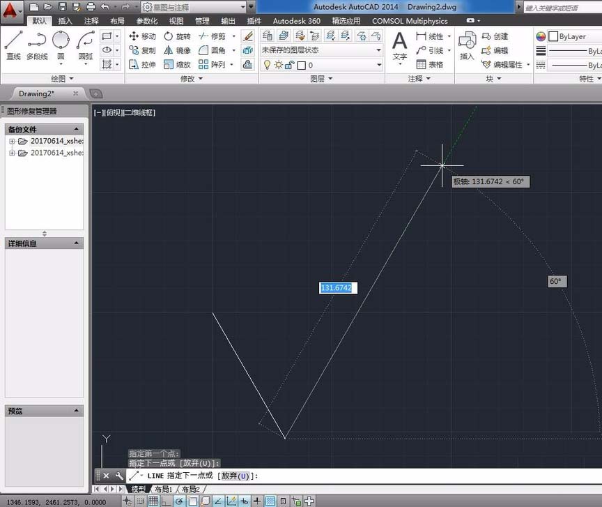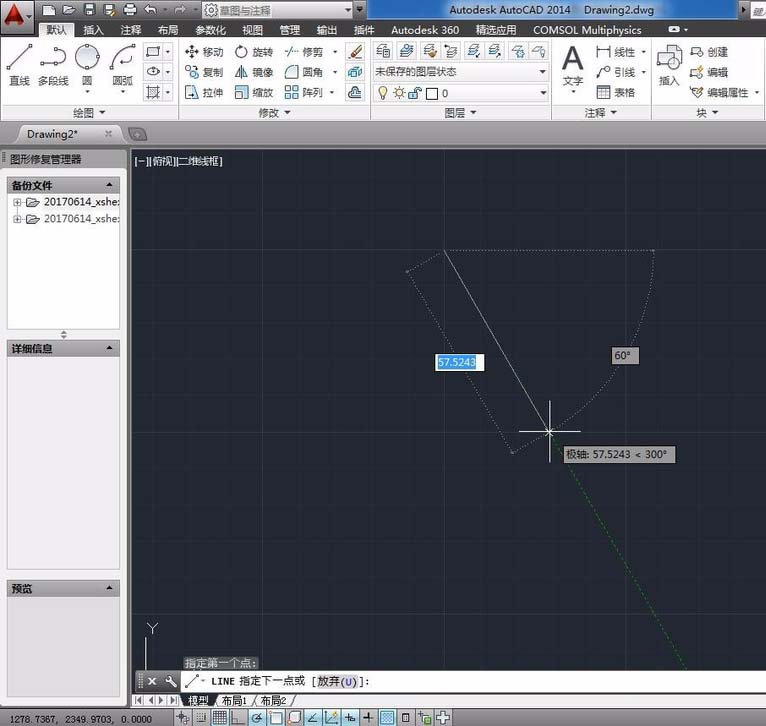 3、开始绘制,追踪角度是30的倍数时有绿色的线条提醒。先画一条边。