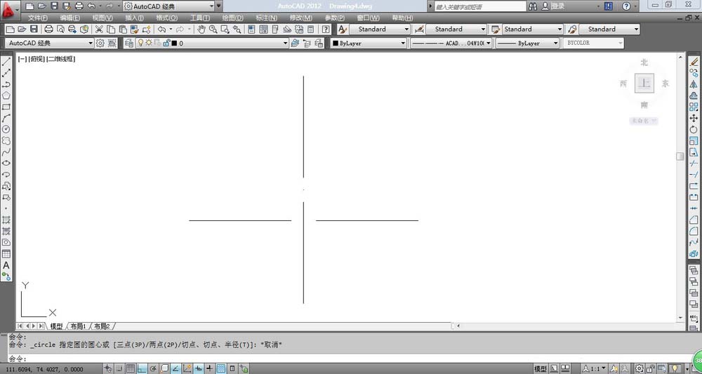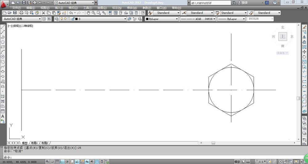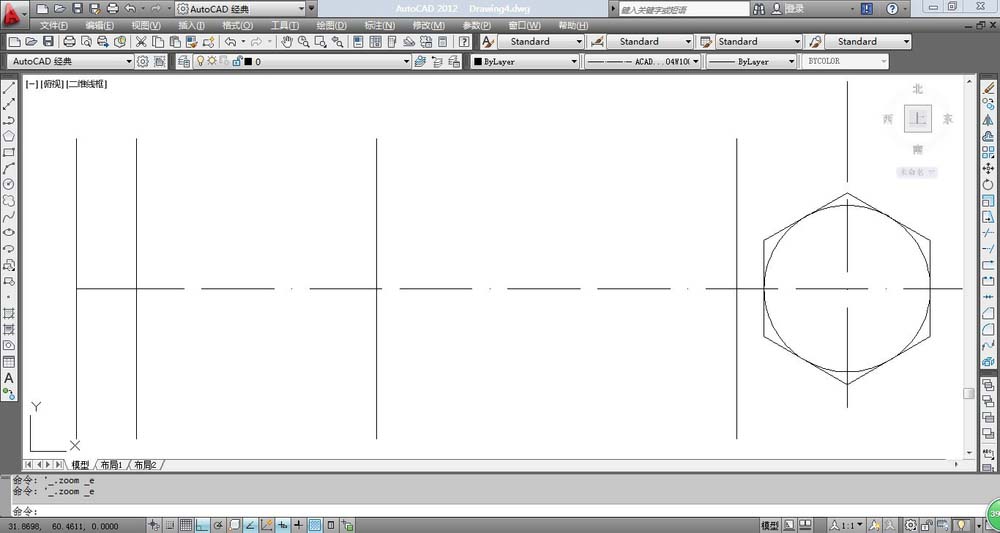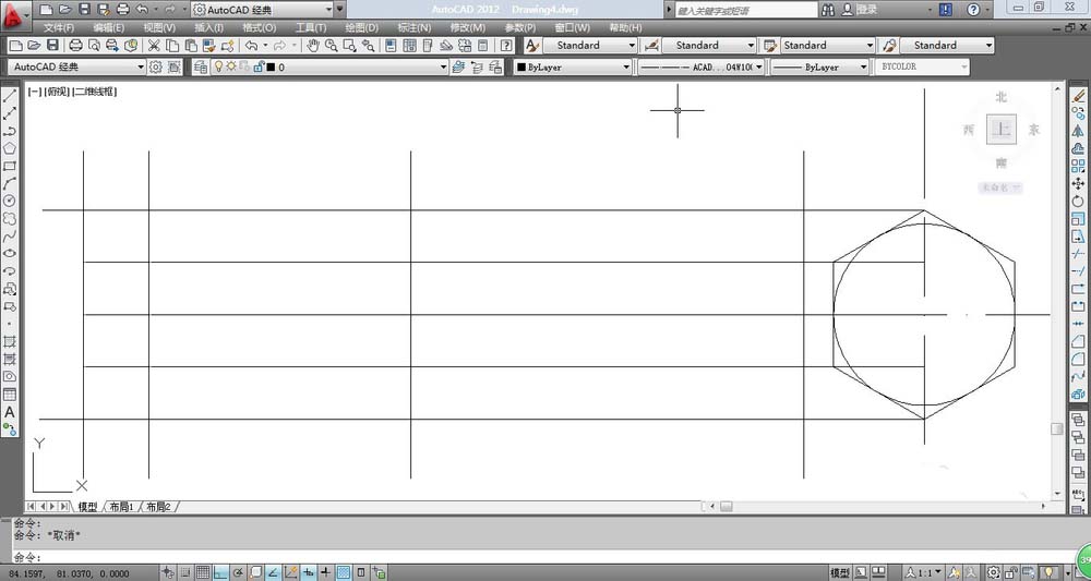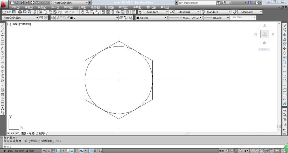 2、输入C快捷键画圆,画一个半径为13.85的圆,以辅助线的交点为圆心,然后在输入POL多边形快捷键,画一个外切与圆的正六边形,最后的结果如图所示。