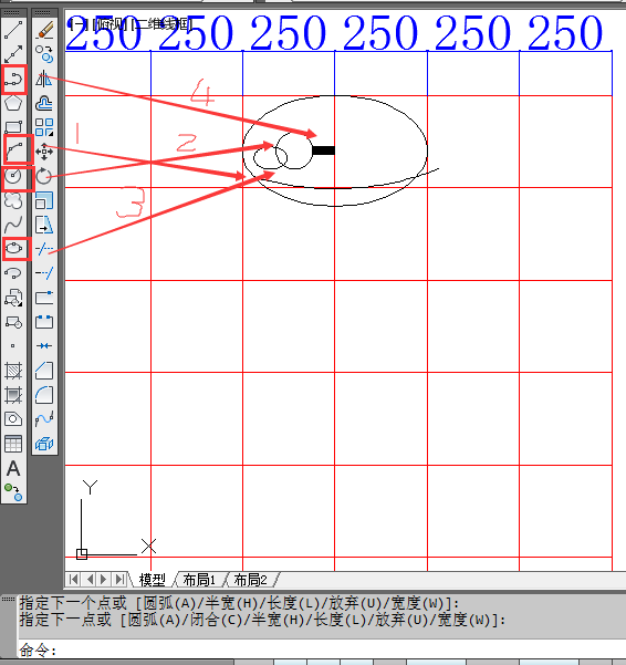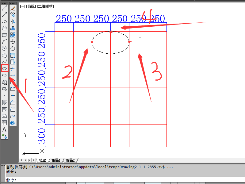 4、、头部框架。点击右边椭圆工具。点击头部格子左边中点偏下方,点击头部格子右边中点偏下方,点击头部格子上方正中央,头部框架搭好了。