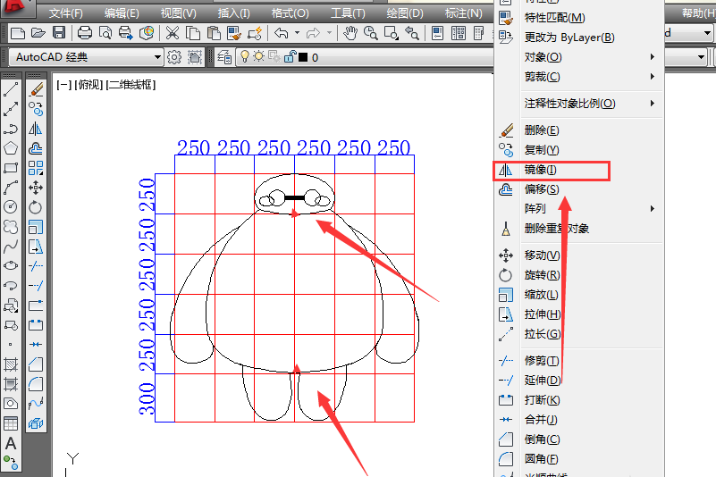 8、镜像完成身体另一半。点击上方修改,点击镜像,选择所需要镜像的对象,再点击中间两点作为镜子,选择不删除源对象即可。