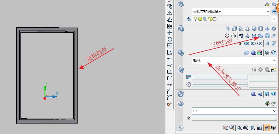 5、三维成型。进入三维工具栏,使用扫掠工具,先选取刚刚创建的面域,右击鼠标。在选择开始创建的矩形路径(路径必须是一个整体),我们会看到镜框已经成形了。