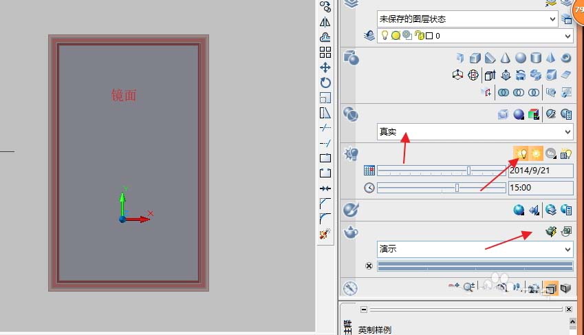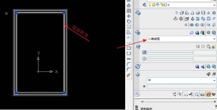6、接下来绘制镜面。输入ucs,新建三维坐标,方便平面图绘制。在进入二维绘图界面绘制镜面。如图所示。然后拉伸平面尺寸。最后使用材质工具分别为镜框和镜面赋予材质。参数设置可以根据需要调整。这里因为电脑显示问题不做说明。在使用着色面工具对镜面着色。由于显卡问题,渲染不太好,大家可根据自己情况进行渲染。最终如下图。