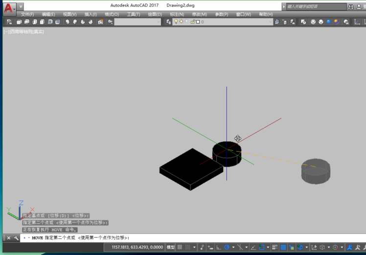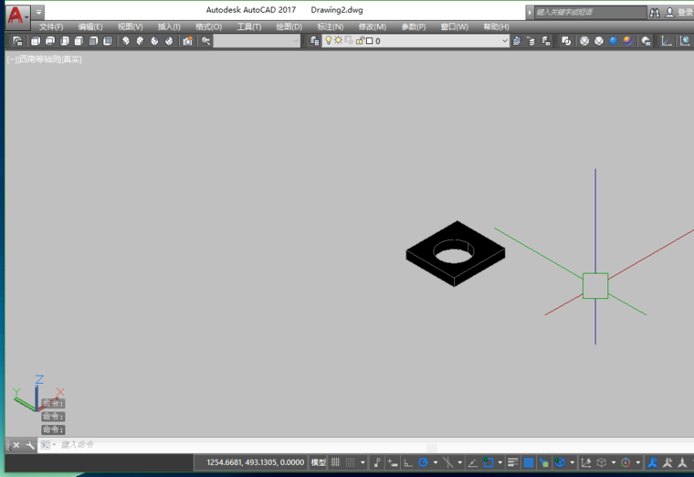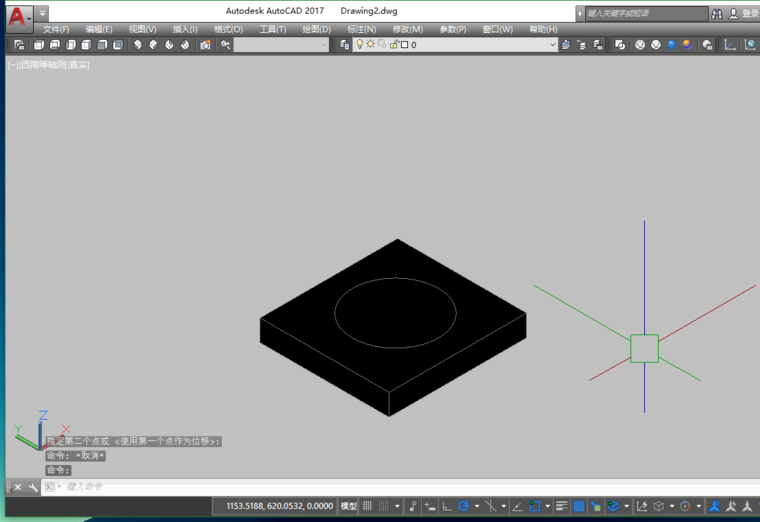 2、我们现在要在这个三维实体上“挖”一个孔,也就是要切除一部分“料”,在Cad三维绘图中,没有直接切除的概念。而是用逻辑运算-“差集”。也就是要切一个什么形状,就要有一个那个形状的三维实体,然后通过差集,将其“切除”。所以,现在需要一个圆柱体。