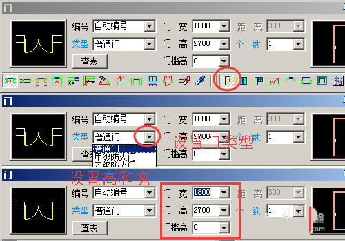 3、在弹出的门窗口中设置门的类型、高和宽等。