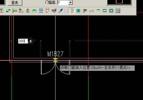 5、各项都设置好以后,我们可以把鼠标放到我们画好的墙上可以看到,点取门窗的插入位置。在左右的数字栏中可以输入距离来精确控制门的位置。