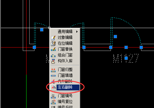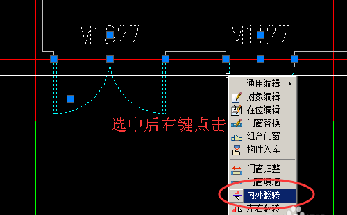 7、平面门插入完成。如果对门的开启方向和内外部满意可以单击右键来调整。选中要调整的门(可多选)然后点击右键。我们选择内外反转。