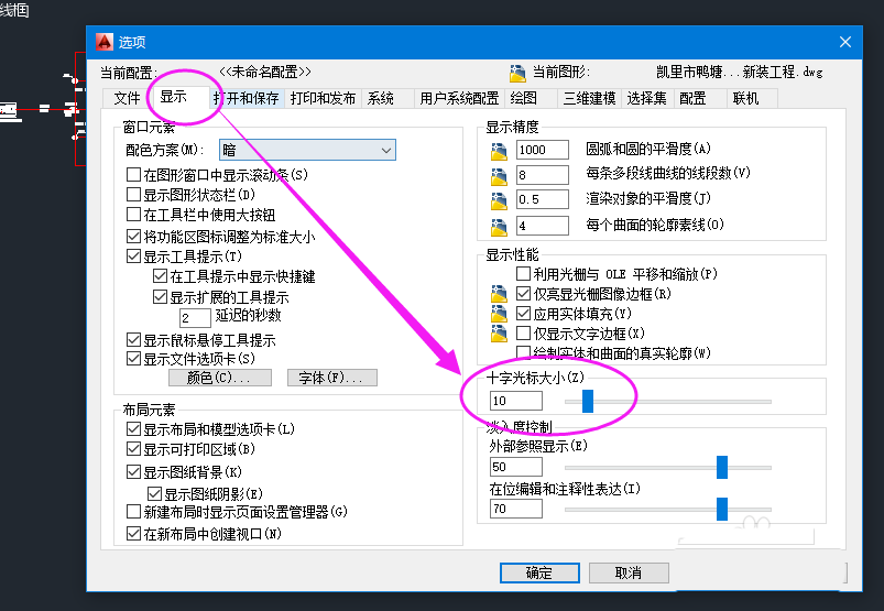 4、在弹出的选项对话框中,找到“显示”栏,然后找到“十字光标大小”,如图所示。