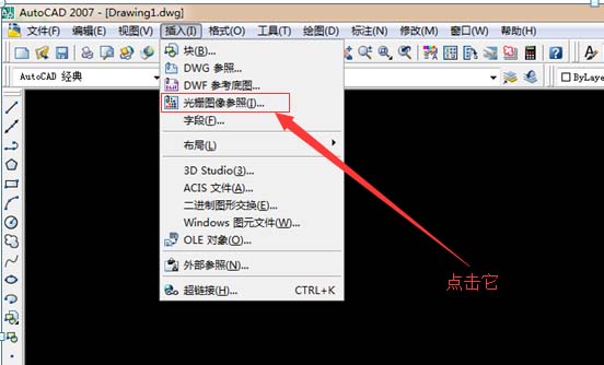 1、打开需要插入图片的cad图纸,然后点击上面工具栏中的插入→光栅图像参照(I)功能键。