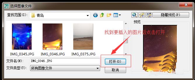 2、在弹出的“选择图像文件”对话框中,在左上角“查找范围”里找到要插入的图片后点击打开。