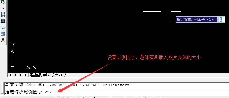 5、这时命令栏出现指定缩放比例因子(1)的提示,我们根据需求设置好比例因子后按回车键。这时图片已经成功插入到cad中了。