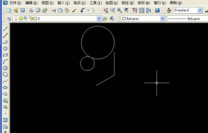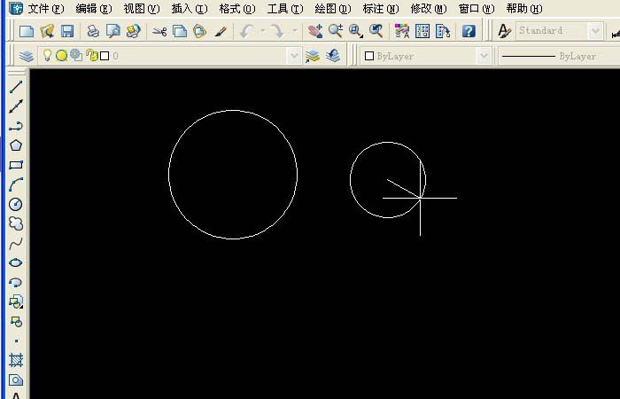 4、在CAD画布上,用鼠标左键单击绘制一个小圆,在右边绘制一根直线后,选择两个相切点后,接着移动鼠标绘制出一个大圆出来,如下图所示。