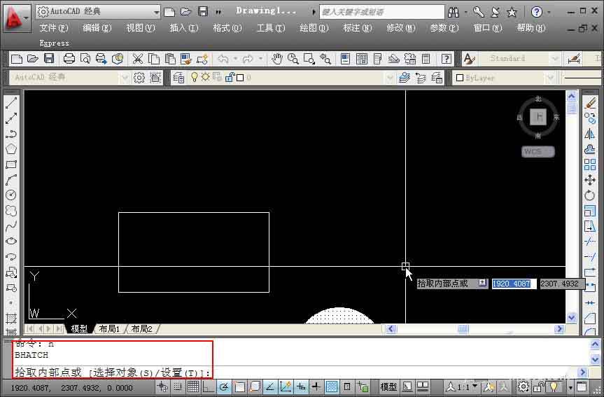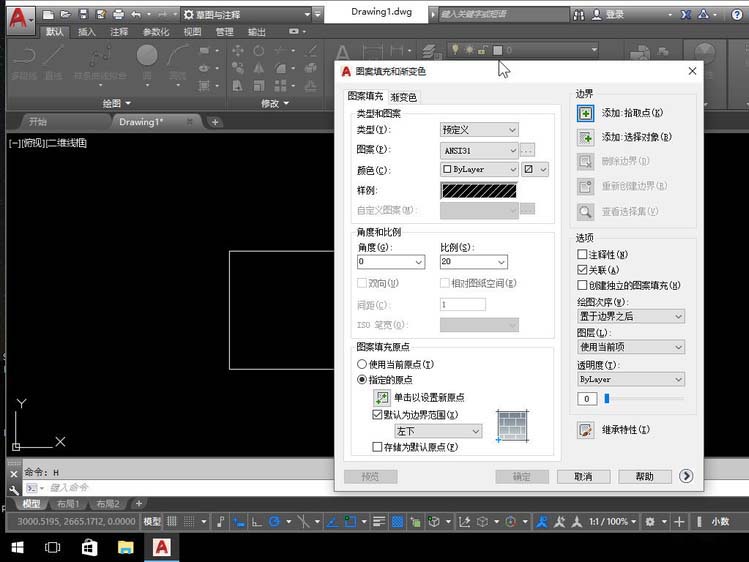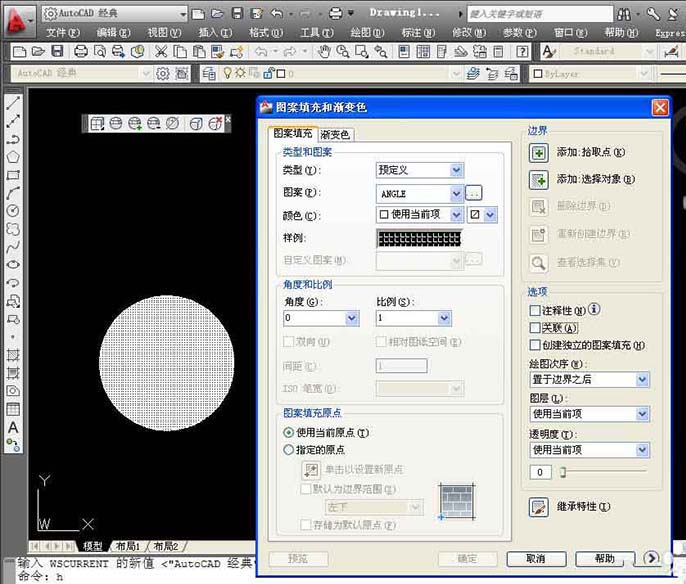 当然有!AUTOCAD也考虑到用户的这种需求,同时也考虑到功能区面板被关闭的状态下(例如按CTRL+0全屏显示后用户如何设置填充参数),因此提供了一个控制填充对话框显示形式的变量:HPDLGMODE。这个变量可以设置成0,1,2三个数值,我们就来看看设置成三个值的效果。