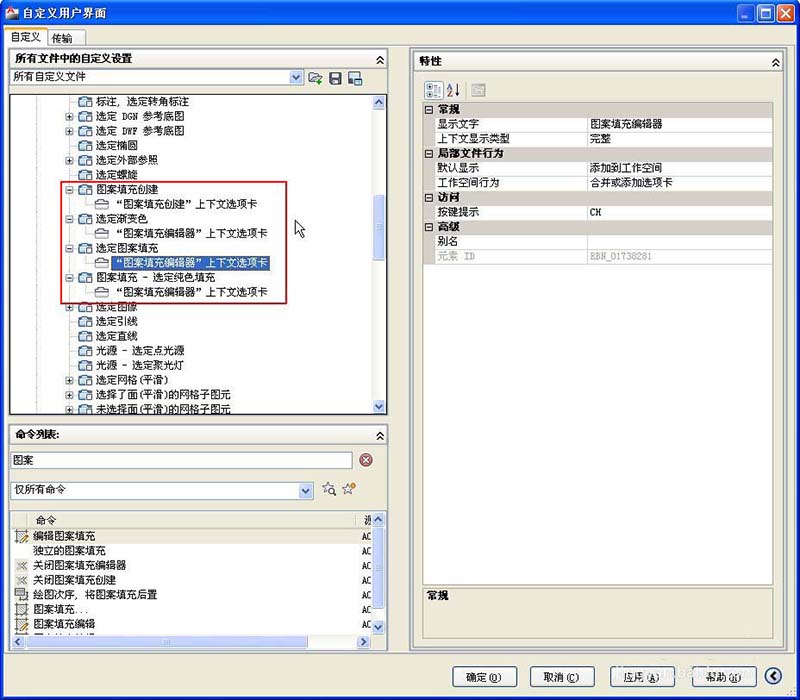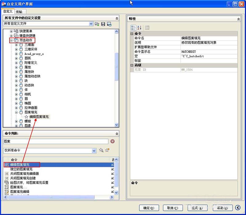 1、调用填充对话框的方法很简单,就是执行填充编辑HATCHEDIT的命令,快捷键HE,但如果想要双击填充时也弹出对话框的话,就需要执行CUI命令,在自定义界面对话框中将填充图案的双击动作设置为填充编辑,如图所示。