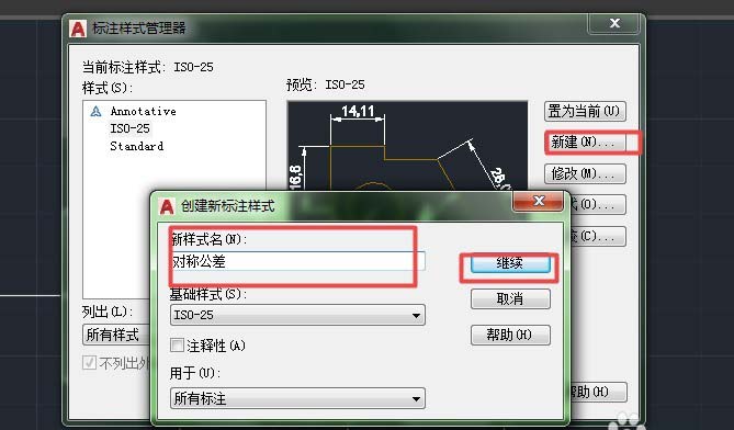 2、在标注样式管理器中选择新建。弹出“创建新标注样式”快捷键,输入样式名为“对称公差”后,选继续。