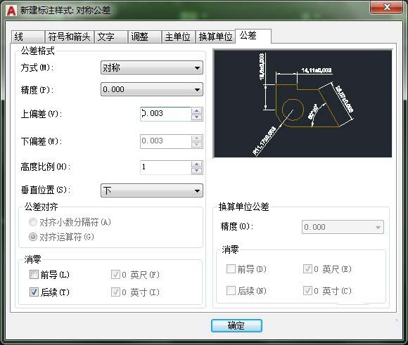 3、在“新建标注样式:对称公差”对话框,选择“公差”一栏,将“方式”改为“对称”,“精度”改为“0.000”,“上偏差”改为“0.003”。